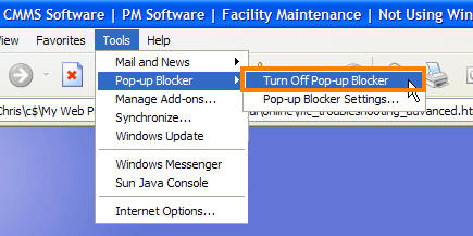 pop-ups from the Maintenance Connection Website